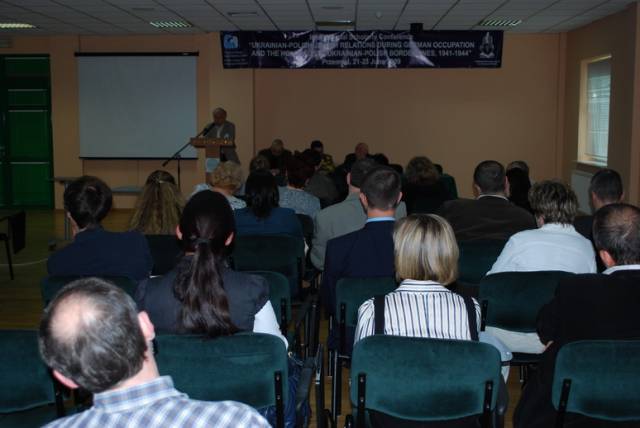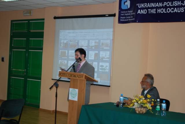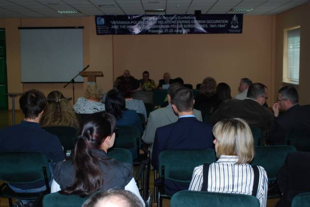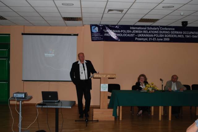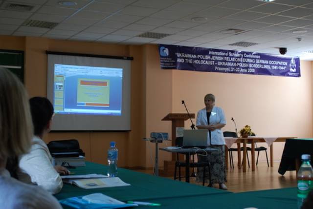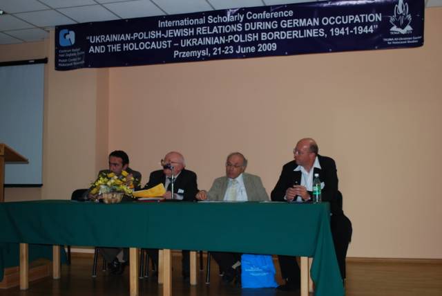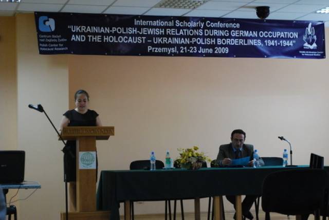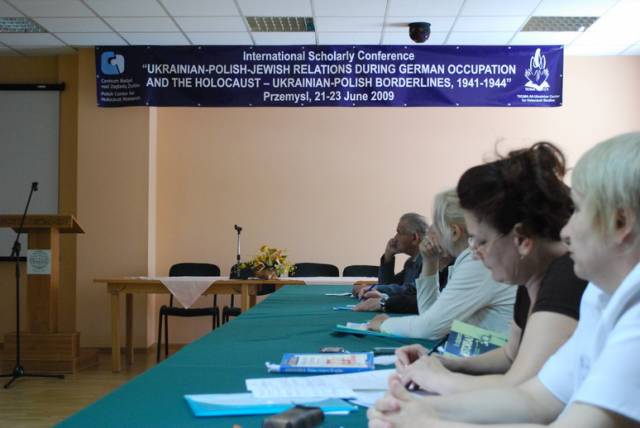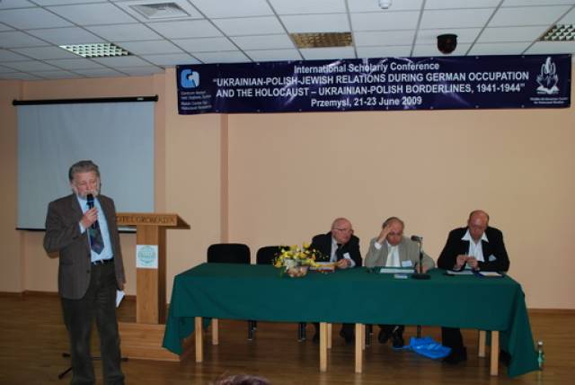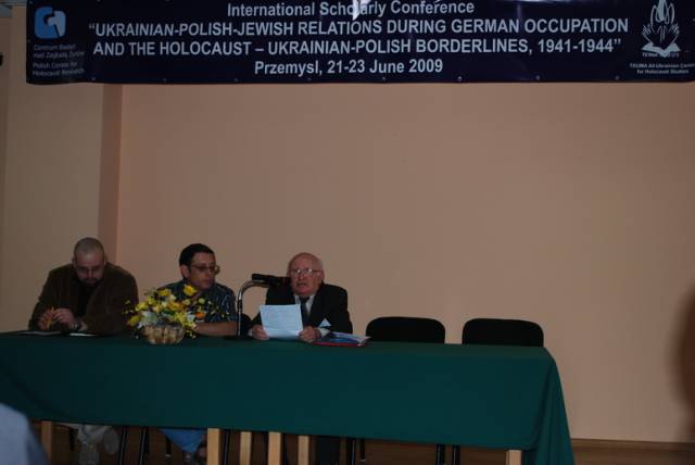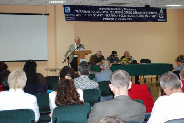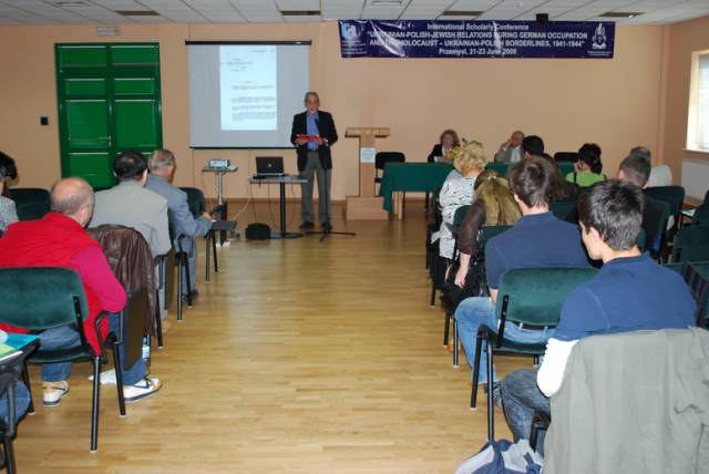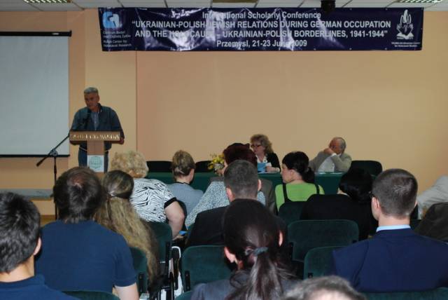Pierwsza sesja poświęcona była analizie źródeł na temat relacji ukraińsko-polsko-żydowskich podczas II wojny światowej. W otwierającym ją wystąpieniu Paweł Szapiro (Warszawa) przedstawił obraz pierwszych miesięcy niemieckiej okupacji Kresów w polskiej prasie konspiracyjnej; prof. Jan Grabowski (Warszawa/Ottawa) zaprezentował – na podstawie bardzo ciekawych akt lwowskiego Sondergerichtu – obraz sytuacji Żydów pod okupacją niemiecką, zaś Marco Carynnyk (Toronto, Kanada) wygłosił komunikat na temat działalności Romana Szuchewicza w świetle materiałów archiwalnych polskich, izraelskich oraz ukraińskich. Referaty te uzupełniły wystąpienia Inessy Nossenko (Zaporoże, Ukraina), prezentujące ukraińską historiografię stosunków żydowsko-ukraińsko-polskich podczas II wojny światowej oraz Łukasza Opozdy (Kraków) na temat relacji polsko-żydowskich we współczesnym dyskursie polskich środowisk skrajnie prawicowych na przykładzie mordu w Jedwabnem. Sesję tę zakończyła bardzo żywa dyskusja panelowa na temat metodologii badań nad zagadnieniem stosunków międzynarodowych w okresach zmian historycznych. W czasie dyskusji poruszano problemy związane z formułowaniem polityki historycznej, obiektywizmu analiz oraz metodologicznych ujęć tematu – w tym ostatnim przypadku, dyskutanci zwrócili uwagę na ważność studiów interdyscyplinarnych. Tematy te zostały poszerzone podczas wystąpień w drugiej sesji, która dotyczyła idei narodowych oraz narodowej historii. I tak: dr Igor Shchupak (Dniepropietrowsk, Ukraina) przedstawił w interesującym wystąpieniu idee narodowe w trójkącie ukraińsko-polsko-żydowskim w latach 1941-1944 oraz jak mity i stereotypy wpływają na formułowanie nacjonalnej ideologii, zaś Tetiana Meleshchenko (Kijów, Ukraina) wygłosiła referat o ideologiach narodowych i narodowej historii na podstawie materiałów dotyczących relacji polsko-ukraińskich podczas II wojny światowej. Ciekawym uzupełnieniem tych punktów widzenia było wystąpienie Łukasza Biedki (Warszawa) na temat poczucia wstydu oraz poczucia dumy i kształtowania psychologicznych zabiegów wokół narodowego wizerunku w debacie historycznej. Sesję tę zakończyła również dyskusja panelowa na temat Ukraińskie, polskie i żydowskie idee narodowe a problem w relacjach międzyetnicznych, podczas której dyskutowano problem nacjonalizmów oraz tzw. „trudnych pytań” w relacjach ukraińsko-polsko-żydowskich. Dzień drugi konferencji otworzyła sesja poświęcona Żydom w czasie Zagłady wobec kwestii „ukraińskiej” i „polskiej” oraz problemowi relacji Żydów i ukraińskiego ruchu narodowego. Sesję tę otworzył interesujący referat prof. Aharona Weissa (Jerozolima) na temat zmian w rozwoju polityki OUN-UPA w stosunku do Żydów w latach 1939-1944 na pograniczu polsko-ukraińskim. Temat ten rozwinął także dr. hab Grzegorz Motyka (Warszawa) w swoim wystąpieniu Ukraińska Powstańcza Armia a Żydzi 1942-1945. Z kolei trzy referaty poświęcono pogromom Żydów na Kresach Wschodnich/Zachodniej Ukrainie po wkroczeniu armii niemieckiej; dr. hab. Andrzej Żbikowski (Warszawa) przedstawił przyczyny oraz znaczenie antyżydowskich pogromów we Lwowie w lipcu i sierpniu 1941 r., Marco Carynnyk omówił rolę OUN w pogromie we Lwowie 1 lipca 1941 roku, zaś dr Oleksandr Kruglov (Charków, Ukraina) zajął się relacjami międzyetnicznymi w kontekście pogromów Żydów na Zachodniej Ukrainie latem 1941 roku. Tematyka ta była również poruszana w czwartej sesji, zatytułowanej Ukraińcy, Polacy, Żydzi w przeddzień oraz wobec niemieckiej okupacji i Zagłady Żydów. W sesji tej prof. Maksym Gon, (Równe, Ukraina) w swoim wystąpieniu przedstawił sytuację Żydów w kontekście ścierających się nacjonalizmów ukraińskich i polskich Ukraińcami i Polakami (1923-1941), zaś dr Faina Vinokurova (Winnica, Ukraina) omówiła relacje ukraińsko-żydowsko-polskie w latach 1939-1944. Z kolei prof. Tetiana Ladychenko (Kijów, Ukraina) w swoim referacie poruszyła problem Żydów na Zachodniej Ukrainie a polskiej polityki emigracyjnej; temat ten uzupełniła dr Olena Suchkova (Donieck, Ukraina), omawiając deportacje ludności polskiej z zachodnich regionów Ukraińskiej SSR w okresie od lutego 1940 do czerwca 1941. Dr Tamara Bakka (Kijów, Ukraina) w swym referacie pokazała stereotyp wizerunku Żyda w polskiej i ukraińskiej ideologii narodowej na podstawie materiałów dotyczących Zachodniej Ukrainy podczas II wojny światowej. Alex Denisenko (Lwów, Ukraina) oraz prof. Wacław Wierzbieniec (Rzeszów) w swoich referatach przedstawili problem stosunków polsko-żydowsko-ukraińskich w miastach Kresów Wschodnich/ Ukrainy Zachodniej; Alex Denisenko omówił przykład Sokala jako “Judenstadtu”, zaś prof. Wierzbiniec na przykładzie Brzeżan i Przemyśla w czasie II wojny światowej zadał pytanie, czy jest możliwe modelowe ujecie specyfiki stosunków polsko-żydowsko-ukraińskich w obrębie jednego miasta. Na pytanie to próbowało odpowiedzieć dwoje naukowców z Lublina; dr Jarosław Kit omówił życie codzienne we Lwowie w okresie II wojny, zaś dr Monika Szabłowska- Zaremba zaprezentowała literackie ujęcie tematu na przykładzie Drohobycza w twórczości A. Chciuka i H. Grynberga. Część naukowa konferencji zakończyła się dyskusją panelową pt. Ukraińsko-polsko-żydowskie stosunki podczas II wojny: problemy i perspektywy badawcze oraz podsumowaniem, w czasie którego uczestnicy zgłosili kilka tematów na kolejne konferencje dotyczące poruszanych w Przemyślu zagadnień oraz konieczność szybkiego opracowania tomów pokonferencyjnych. Dzień trzeci, jak wspominano, poświęcony był w całości warsztatom dla nauczycieli polskich i ukraińskich, podczas których mieli oni okazję zapoznać się z programami nauczania, sposobem poruszania tematów relacji polsko-żydowsko-ukraińskich w podręcznikach szkolnych oraz meto